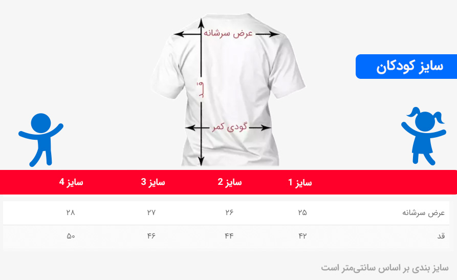 برای انتخاب دقیقتر سایز، میتونید به راحتی از دو راهنمای تصویری زیر استفاده کنین و سایز مناسب تیشرت خودتون (یا کوچولوتون) رو پیدا کنید.
